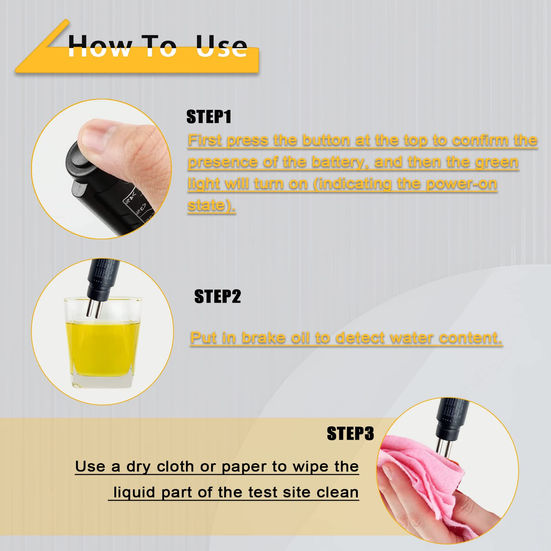 Product Name:2PCS Brake fluid test pen The probe of the brake fluid test pen is made of high quality metal material to prevent oil and oxidation; the shell is made of black matte plastic for better slip resistance and overall excellent feeling. This product can quickly detect the health of your car's brake fluid and remind you to replace it when necessary, thus avoiding traffic accidents and making you more comfortable and safer. Features: 1. Easy to use, small size, easy to carry. 2. Metal probe: oil and oxidation resistant, not easy to corrode. 3. Shell: better anti-slip, good texture of the body. 4. 5 LED indicators show the percentage of water in the brake fluid. The 5 LED indicators will show the percentage of water in the brake fluid in green, yellow and red colors. It clearly shows the level of water contained through the light emitting diodes. A high water content will result in a lower boiling point and affect braking performance. Red indicates that the brake fluid needs to be replaced immediately, green indicates a good condition, and yellow indicates an acceptable condition but will be replaced soon. 1. Green LED=water content in brake fluid H2O<1.5%, brake fluid is qualified. 2. yellow LED=water content in brake fluid H2O=1.5% to 3%, can continue to use and test again after six months. 3. red LED = water content in brake fluid H2O>3%, can not continue to use, need to replace the brake fluid red LED: replace the brake fluid. High quality: This brake fluid tester is made of nickel-plated metal probe, which is resistant to oil and oxidation and not easy to corrode. The shell is black matte plastic, better anti-slip and good body texture. The change of conductivity can be used to determine the change of moisture in the brake fluid. Safe driving: This brake fluid tester comes with 5 LED indicators to show the percentage of moisture in the brake fluid. This product can quickly detect the health of the car's brake fluid, provide you with more accurate test results, and remind you to replace the brake fluid when necessary to avoid traffic accidents. Convenient and quick: This brake fluid tester is easy to use, press the button, insert the test pen, the indicator is accurate to 1%, and you can receive the result in seconds. To save electricity, the test pen will automatically turn off the power after 20 seconds each use to save power. Scope of application: This brake fluid tester is suitable for testing the moisture content in DOT-3, DOT-4, DOT-5.1 brake fluid. It is also very convenient for personal use and this product is widely used in personal workshops, repair shops and dealer workshops. Easy to carry: No cable connector design, small size, light weight, easy to carry and use. If you encounter any problem when using this product, please contact us and we will try our best to solve it for you.