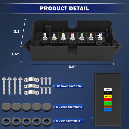 UPGRADE TRAILER WIRING: The trailer wiring junction box is ideal for wiring your trailers, RVs, campers, caravans, food vans and other towed vehicles, it's perfect for connecting tail lights, brake lights, reversing lights, turn signals and auxiliary power. Helps your wiring stay organized, making adding extra lights and accessories, troubleshooting and repairing electrical problems a breeze COLOR-CODED TERMINAL: The wires connection box is equipped with 7 color-coded terminals, which can quickly identify the corresponding functions of the wires and facilitate wiring, keeping all your trailer wiring in order HEAVY DUTY JUNCTION BOX: The premium waterproof and sealed 7 pin trailer junction box is made of thickened reinforced plastic, which is sturdy and durable with a longer service life, and has better sealing against water and sand dust PACKAGE INCLUDING: The electrical cables connection box includes 1 pc junction box with 7 wire studs, 2 pcs stickers, 10 pcs screws, 2 pcs fasteners, 5 pcs open grommets and 5 pcs closed grommets QUALITY ASSURANCE: We are confident in the quality of the trailer junction box, if you are not satisfied or have questions after receiving the product, don't hesitate to contact us