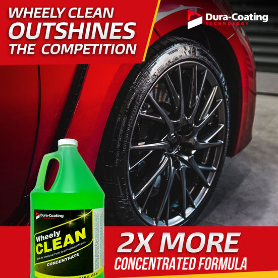 Dura-Coating Wheely Clean is our most powerful and effective wheel and tire cleaner. The ultra-concentrated, high-performance tire cleaning formula does the hard work for you and easily removes brake dust and oxidation, restores the original finish, and melts embedded debris to brighten and shine your wheels and rims. It’s a versatile wheel and tire cleaner that can also be used as a pre-treatment before you polish to remove stains, reducing polish time and the amount of polish you need to use. Wheely Clean is safe for glass, non-painted & clear coat wheels. Fast and easy to use, simply spray Wheely Clean on and let dwell for 1-2 minutes without allowing the product to dry out. Scrub with a wheel brush and rinse thoroughly. Biodegradable and absolutely awesome! You'll love Wheely Clean. Make your own dilution rate with our concentrated Wheely Clean. Made for heavy duty cleaning jobs and pre-cleaning metal before polishing. ULTIMATE CLEANER: Say goodbye to stubborn brake dust and road grime! Our concentrated Wheely Clean formula quickly restores your wheels to their original luster. Don’t let brake dust dull your shine—Wheely Clean brings back that showroom sparkle effortlessly. GLOSS POWER: Transform your wheels with exceptional gloss enhancement! Our high-performance cleaner not only removes tough stains but also rejuvenates heavily soiled rims. Experience the brilliance of your wheels as they dazzle with a clean, glossy finish that’s hard to miss. VERSATILE USE: Wheely Clean isn't just for wheels—it's a versatile addition to your car care kit. Safe for use on glass, non painted, and clear coat surfaces, it’s perfect for chrome and aluminum wheels. This all-in-one solution caters to all your automotive detailing needs, making your vehicle shine from every angle. EASY SCRUB: Enjoy the convenience of fast and easy wheel cleaning! Simply spray on Wheely Clean, let it soak for 1-2 minutes, scrub thoroughly with a wheel brush, rinse with water, and watch as it works its magic while air drying. This efficient and highly effective formula makes wheel maintenance a breeze. MADE IN THE USA: Proudly crafted in Naples, Florida, by Dura-Coating, our products reflect our American heritage. Our professional grade car detailing solutions deliver reliable results. As a small family business, we are committed to providing quality products that we use in our own car detailing shop, making sure you get products you can trust.
