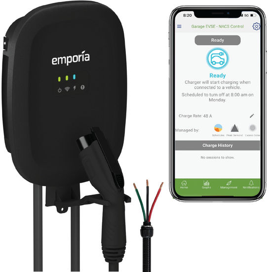 Introducing the Emporia Level 2 Electric Vehicle Charger—where cutting-edge technology meets award-winning performance. This charger not only received the highest accolade from Motortrend as the "Best Smart EV Home Charger" in 2023 but also set a new industry standard by scoring 99 out of 100 to be named the "Best Electric Car Charger of 2024" from industry professionals at InsideEVs.com and State of Charge. Designed with your safety in mind, this UL-listed and ENERGY STAR certified charger meets strict safety standards, including NEC 625, SAE J1772, UL 817, UL 991, UL 2231, UL 2251, and UL 2594. It is built tough with a NEMA Type 4 watertight enclosure, ensuring durability whether installed indoors or outdoors. It comes preconfigured with a NEMA Type 14-50P plug and a 22-inch cable, compliant with 2017 NEC Section 625.17(A)(3). It supports up to 40A charge rates as is, or it can be converted to a hardwired setup to accommodate up to 48A, ensuring it is a fit for every space and requirement. A professional electrician is recommended for installation to achieve the best results and maintain safety standards. Emporia’s charger is universally compatible with all electric vehicles and plug-in hybrids in North America, including all Tesla models (adapter required). Take advantage of smart charging features with a required 2.4 GHz WiFi connection. Utilize the mobile app available for iPhone, Android, or via a Web Browser to monitor energy use, schedule charging times to benefit from lower utility rates, and manage charging settings remotely. When paired with the Emporia Vue Smart Home Energy Monitor, the system maximizes efficiency by charging with excess solar power and minimizing costs during peak electricity demand. Enjoy peace of mind with a 3-year warranty and check your local area for potential incentives and rebates. Upgrade your EV charging experience with Emporia’s Level 2 Charger—a smart choice for smart drivers. Up to 9x Faster Charging Speed: The Emporia electric vehicle charger provides up to 46 miles/hour charging speed via hardwired connection (48 amp - up to 9x faster than a standard wall outlet). Versatile Installation Options: Preconfigured for Hardwired Install with Whip for up to 48A. Professional installation recommended for optimal safety and performance. Safety, Certification, and Peace of Mind: UL listed and ENERGY STAR certified, meeting stringent standards (NEC 625, SAE J1772, UL 817, UL 991, UL 2231, UL 2251, and UL 2594). Get the Benefits of Smart Charging: Connect via 2.4 GHz WiFi to access real-time energy data and manage charging from your mobile device. Schedule charging sessions to optimize utility rates and performance. Universal Compatibility: Equipped with a secure SAE J1772 connector, compatible with all EVs in North America, including Tesla, VW ID 4, Nissan Leaf, Ford Mustang Mach-E, IONIQ 5/6, BMW i3, i4, iX, Audi, and Jeep Wrangler 4xe.