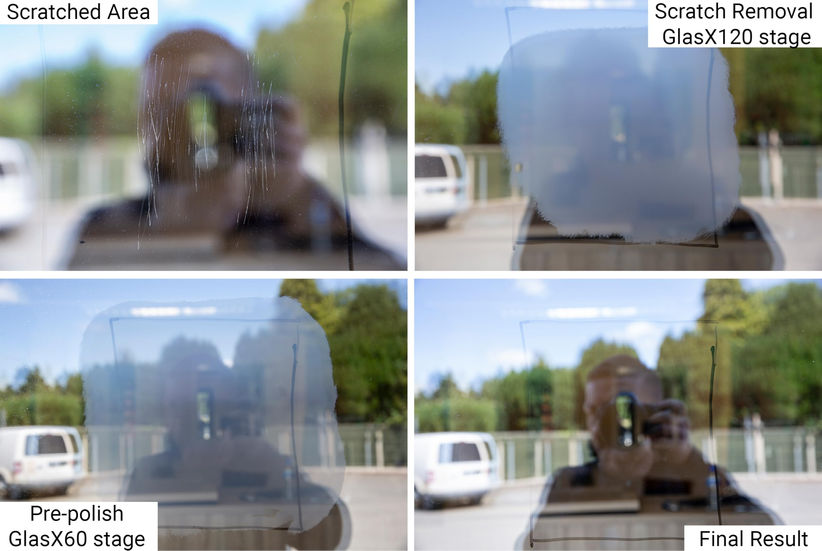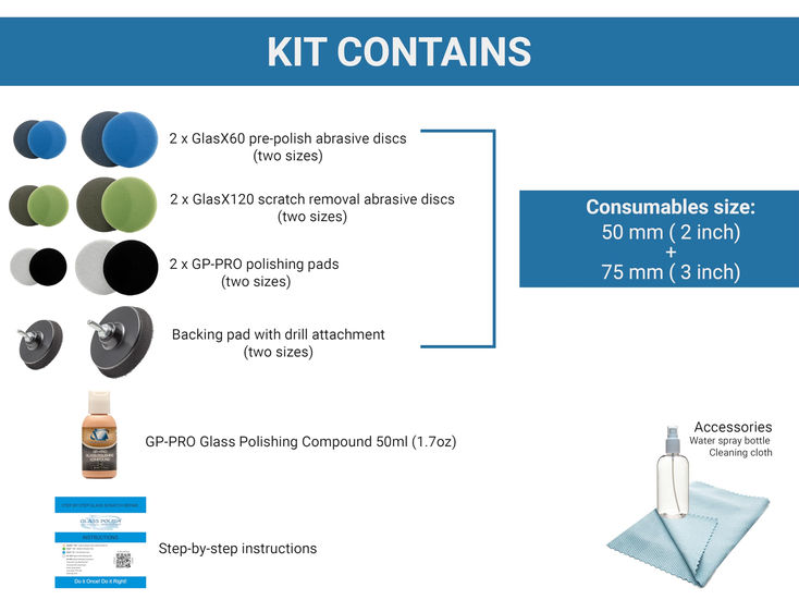 This is the 4th generation Glass Renovation System developed by Glass Polish Technicians. Poweder by GlasX sanding discs constructed from the highest quality silicon carbide for great performance, excellent lifespan and swirls free cut against any glass surface. Kit can be used on any type of glass surface and will allow you to remove: light and heavy scratches, hard water deposits, limescale, graffiti, acid etching and sandpaper damage. Deluxe Dual-Size Components this System is designed for use with a electric drill. Recommended speed 1500-2500 RPM. KIT CONTAINS 2 inch Hook and loop backing pad with a universal drill attachment 3 inch Hook and loop backing pad with a universal drill attachment 2 x 2 inch GP-PRO Felt Polishing Pads 2 x 3 inch GP-PRO Felt Polishing Pads 2 x 2 inch GlasX 60 Fine Grade Sanding Disc / Blue 2 x 2 inch GlasX 120 Medium Grade Sanding Disc / Green 2 x 3 inch GlasX 60 Fine Grade Sanding Disc / Blue 2 x 3 inch GlasX 120 Medium Grade Sanding Disc / Green 1.7oz GP-PRO Glass Polishing Compound 3.4oz Water Spray Bottle Cleaning Cloth Step by step instructions with damage repair guide ✅ DELUXE KIT: Dual Size Scratched Glass Repair Kit for Do It Yourself use with an Electric Drill ✅ DIAMETER: 2'' (50mm) and 3'' (75mm) Pads for Glass Scratch Removal on Small and Medium Areas ✅ REMOVES: Scratches, Scuffs, Graffiti Scratches, Acid Etching & Surface Damage ✅ SUITABILITY: Safe to use on all Glass Surfaces, Mirrors, Automotive, Laminated & Tempered Glass ✅ PRO SPEED: 3 times Faster Sanding Action with this DIY version of our xNet PRO system