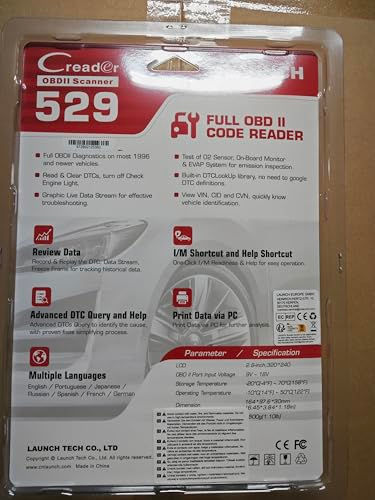 【2024 Amazon’ Choice OBD2 SCANNER LAUNCH X431 CR529, MORE POWERFUL THAN FOXWELL NT301】LAUNCH CR529 OBD2 scanner add more OE-Level features ➤ Read/Erase codes ➤retrieve I/M Readiness and freeze frame data ➤Check Engine Light ➤Patented One-Click Smog Check ➤ show live data in the text and graph format ➤O2 Sensor ➤EVAP Test (Mode 8)➤advanced On-board Monitoring (Mode 6) etc. Not only this obd2 scanner got Amazon’s X431 Choice, but also rank in editorial recommendation all the time 【DATA RECORD & REPORT & PRINT + FREE LIFETIME UPDATE】This X431 code reader can ability to graph, data record, playback, print report via PC (share via email) for further analysis, Diagnostic Report automatically records the basic diagnosis report, will help users avoid blind maintenance, saving money/time make diagnostic easily [One-Click Lifetime Free Update] extend its using life and ensure the data is accurate 【WIDE VEHICLE COVERAGE +7 LANGUAGES SUPPORT】The LAUNCH X431 Car Diagnostic Scanner can be used regardless of the type of your vehicle, as long as it is OBD2 compliant (1996 and newer): KWP2000, ISO9141, J1850 VPW, J1850 PWM and CAN. Multiple language option is also packed: English, French, Spanish, German, Portuguese, Russian, Japanese 【USER-FRIENDLY DESIGN + VIEW VIN/CIN/CVN】 This X431 Car Scanner is Plug & Play, no battery required, 2.8″colorful LCD display screen, offers visual for readiness verification.[I/M & Help shortcuts] for easy operation. [DTC Lookup ] is to view the detailed definitions of DTCs stored in the built-in DTC library. [Red-Yellow-Green LEDs]indicate vehicle’s status visually, to avoid unnecessary step-to-step operations. [VIEW VIN/CIN/CVN] fastly retrieves vehicle VIN for troubleshooting accurately. 【COST-EFFECTIVE】 We offer 30 days of return service, 1-year fr.ee repair service for non-human-caused hardware issues, and 5 years of technical support for any software issue. Plug & Play, no battery required; View VIN/CIN/CVN, DTC LookUp, Data Playback and Print etc. The diagnostic code reader classic and solid design to withstand everyday shocks. Whether you’re a home car owner or an auto mechanic, with CR529, you can save ollars on car maintenance, save time and effort on repairs, and improve your car’s lifespan/performance.QUANTITY