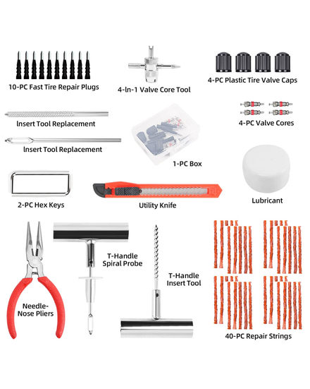 ★ Description: ▶1 X Heavy Duty T-handle made of metal with needle for expanding the repair point ▶1 X Heavy Duty T-handle made of metal forpulling on the vulcanizing strips ▶1 X forceps to remove the foreign bodies from the tire ▶1 X grease crucible facilitates insertion of the T-handle with needle ▶2 X Allen key for loosening the inserts from the T-handles ▶1 X Open Needle ▶1 X Blade Needle ▶1 X miniature knife ▶40PCS 4" Self-Vulcanization Tire String. ▶1X Small Box ▶1X Plastic case for storage ▶1 X 4 way valve tool shank ▶4 X Plastic Head Screw Knob ▶4 X Valve Core ▶10Pcs fast tire repair plugs. 【70-in-1 TIRE REPAIR】A total of 70pcs tire repair kit accessories include tire repair plugs, repair strings, lubricant, insert tool replacement, handle insert tool, nose pliers, knife and so on. You don't need any extra tools, we've got everything for you. Only have to pay once to get it all. 【STURDY & DURABLE】Our tire repair kit is made of refined high-quality steel & zinc alloy less prone to rust.High-quality tire strips Made of butyl rubber and natural rubber vulcanization, product to keep flexible ,less prone to aging. 【EASY TO USE】Almost all driver have experience-a sudden puncture when driving carefree along the road. The tire repair plug kit can help you get back on the road quickly. All tire change kit tools when prevented are in a handy suitcase that you can keep in the car without taking up space. 【POWERFUL FUNCTION】Based on years of experience in selling tire repair tools, we have developed a set of tire repair tools that is essential for every family. It improves all the shortcomings in the use of tire repair tools to meet every use scenario and car.Works with any tubeless tire - Emergency patch for truck, bike, lawn mower, sedan + many more. 【24/7 CUSTOMER SUPPORT】ORCISH is an integrated industry and trade company specializing in the automotive field, with a close process from R&D production to sales. Our aim is to create better products for owners to solve various problems. So please do not hesitate to contact us if you have any questions on the product. We will be responsible for our products to the end.