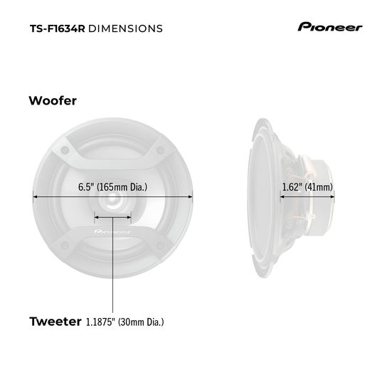 The PIONEER TS-F1634R car audio speakers stand out as a pinnacle of audio quality, featuring a 2-way coaxial design that integrates a woofer and tweeter for a balanced sound spectrum. With a standard 6.5-inch diameter, these round speakers effortlessly fit into various car interiors, offering versatility and high-performance capabilities suitable for a wide range of vehicle models. Boasting a robust power handling capacity of 200 watts (25w nominal) and an impedance of 4 ohms, these speakers deliver a potent audio output. Bump up your sound and experience high quality, low distortion with a sensitivity rating of 88. No matter your preferred music genre, receive an improved sound with the broad audio frequency response range of 31 Hz to 16 kHz. The sleek black finish not only adds a touch of style but also seamlessly blends aesthetics with top-notch sound performance, ensuring a compelling and immersive listening experience for car audio enthusiasts. Upgrade your speakers today, and experience improved sound quality, enhanced bass, and clear vocals, bringing your music to life on the road. Enjoy the Pioneer quality and elevate your in-car audio experience. Power Handling - Delivering 200W (25W nominal) with 4-ohm impedance, these speakers combine style and high-quality sound for a dynamic audio experience. 2-Way Coaxial Design - The innovative coaxial setup integrates a woofer and tweeter for balanced, immersive sound, ensuring a full range of frequencies during your drive. Sensitivity - With an 88dB sensitivity rating, enjoy distortion-free music at higher volumes, ensuring a clear and loud audio experience with lower power inputs. 6.5" Standard Sizing - Designed with a standard 6.5-inch diameter, these speakers seamlessly integrate into most car interiors, offering versatility without compromising performance. Traditional Black - The sleek black finish enhances aesthetics and complements any vehicle interior, combining style seamlessly with high-quality sound.