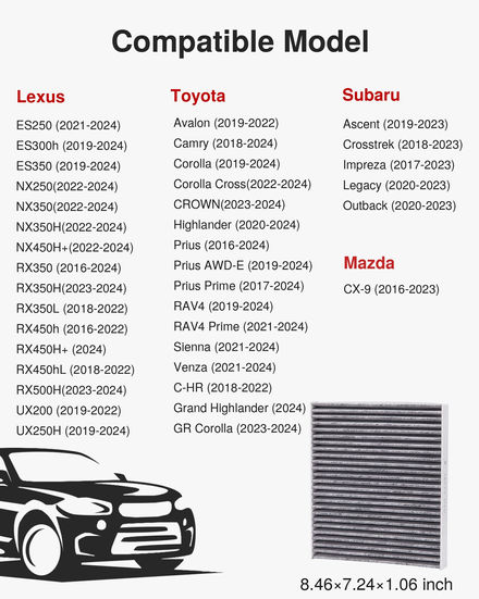 Designed with an activated charcoal layer located inside the filtration material, efficiently removes dust, pollen, and soot. Keeps your vehicle interior clean, ensuring clean and fresh air inside your vehicle. Recommended: Replacement every 12 months or 12,000 miles or as specified by the vehicle manufacturer. Check for air filter replacement if a musty odor emits from the vehicle's ventilation system. Check for air filter replacement if the vehicle's Heating, Ventilation, and Air Conditioning (HVAC) System exhibits poor performance or efficiency. Check for air filter replacement if the air inside the vehicle is not well circulated. Compatible model and year list: (including but not limited to) NOTE: Please check if this filter matches your car in the upper left corner before purchasing. LEXUS: CT200H(2011-2017), ES300H(2013-2018), ES350(2007-2018), GS300(2006), GS350(2007-2011), GS430 (2006-2007), GS450h(2007-2011), GS460(2008-2011), GX460(2010-2022), HS250h(2010-2012), IS250(2006-2013), IS350(2006-2013), IS-F (2008-2014), LF-A (2012), LS460 (2007-2017), LS600h(2008-2016), LX570(2008-2021), NX200t(2015-2018), NX300 (2018-2021), NX300h (2015-2021), RX350 (2010-2015), RX450h (2010-2015), UX200 (2020). Toyota: Avalon (2019-2022), Camry (2018-2022), Corolla (2019-2022), Corolla Cross (2022), Highlander (2020-2022), Prius (2016-2022), Prius AWD-E (2019-2022), Prius Prime (2017-2022), RAV4 (2019-2022), RAV4 Prime (2021-2022), Sienna (2021-2022), Venza (2021-2022). Mazda:CX-9 (2016-2021). Subaru: Ascent (2019-2021), Crosstrek (2018-2021), Impreza (2017-2021), Legacy (2020-2022), Outback (2020-2022). Efficient Filtration: Particles are prevented from entering the cabin by a close-meshed, non-woven filter layer that protects your engine from wear to extend the life of your vehicle's system. It also optimizes air conditioning and heating systems, ensuring high flow capacity. Odor Elimination: The soda-woven and activated carbon combined filter effectively captures contaminants that cause foul odors, resulting in a pleasant and refreshing driving experience for both you and your passengers. Improved HVAC Performance: The close-meshed, non-woven filter layer of the Puroma cabin air filter prevents particles from entering the cabin, which improves overall HVAC performance while preventing increased engine wear. It is recommended to replace your cabin air filter every year or every 12,000 miles. Those driving in heavily polluted areas or on dirt roads should change it every 5,000 miles for optimal performance. Easy to Install: Puroma cabin air filter is a perfect fit and takes only 10 minutes to install. With an easy-to-read airflow arrow on the side, the installation process is a breeze. Please check if this filter matches your car in the upper left corner before purchasing to ensure the part will fit your vehicle. Compatible Auto List: Our cabin air filter is compatible with Toyota: Avalon (2019-2022), Camry (2018-2024), Corolla (2019-2024), Corolla Cross(2022-2024), CROWN(2023-2024), Highlander (2020-2024), Prius (2016-2024), Prius AWD-E (2019-2024), Prius Prime (2017-2024), RAV4 (2019-2024), RAV4 Prime (2021-2024), Sienna (2021-2024), Venza (2021-2024), C-HR (2018-2022), Grand Highlander (2024), GR Corolla (2023-2024).