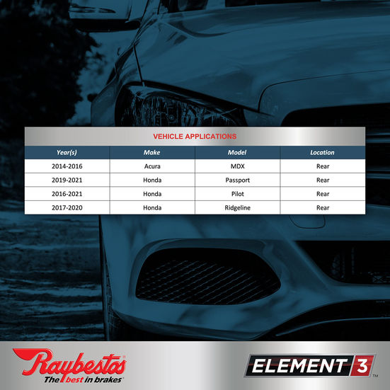 Raybestos Element3 Replacement Front & Rear Disc Brake Pads Sets come with Hardware features Enhanced Hybrid Technology formulations that combines the best attributes of both ceramic and semi-metallic all in one brake pad. Key features of this top-of-the-line braking technology includes 20 to 25% stopping power during aggressive braking and 35% improved pad wear and durability. Additionally, five layered shims with electronic wear sensors promote quiet stopping in a wide variety of temperature ranges. For easy installation, abutment clips, piston clips, spreader springs and anti-rattle clips are included. With more than one million miles of on-road testing conducted across domestic, import, light truck and fleet vehicles, drivers looking for unprecedented braking control and stopping power should look no further than Enhanced Hybrid Technology brake pads. SUPER PREMIUM GRADE: Raybestos Element3 Brake Pads combine the best attributes of both ceramic and semi-metallic all in one brake pad SUPERIOR BRAKING POWER: Enhanced hybrid technology provides increased stopping power during aggressive braking along with improved pad wear and durability QUIET STOPPING: Five layered shims with electronic wear sensors promote quiet stopping in a wide variety of temperature ranges RIGOROUSLY TESTED: More than one million miles of on-road testing showed 20 to 25 percent improved stopping power, reduced noise and 35 percent wear reduction VEHICLE APPLICATIONS: 2014-2016 Acura MDX; 2019-2021 Honda Passport; 2016-2021 Honda Pilot; 2017-2020 Honda Ridgeline
