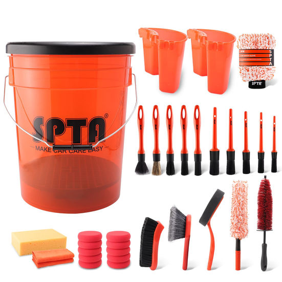 SPTA 31Pcs Car Wash Cleaning Kit, 20L Scratch Free Detailing Bucket with Car Wash Filter Wash Mitt Sponge Towels Tire Detailing Brush Set, Exterior Interior Car Detailing Set, Complete Car Care Tools Car Care Wash Tools Set Car detailing kit interior cleaner Car Wash Cleaning Tools Kit Exterior Interior Detail Kit Car Detailing Set Car Interior Detailing Kit Car Wash Bucket with Dirt Trap Scratch Free Detailing Bucket And Accessories Car Wash Kit 33PCS Car Wash Kit: 1 filter, 1 20L bucket, 1 bucket lid, 2 bucket holders, 10 orange brushes, 10 hand sponges, 1 fabric seat brush, 1 small wheel brush, 1 ultrafine fiber wheel brush, 2 40cmx40cm towels, 1 car wash glove, 1 wheel brush, 1 tire waxing brush, 1 car wash sponge. High quality materials: Car cleaning kits have varying degrees of softness and hardness, which can meet different cleaning needs. But they are gentle with paint and tough against dirt or grime. Cleaning fragile surfaces is absolutely safe. Loose hand washing gloves help protect hands and reduce damage to the skin. Multipurpose: Suitable for cleaning both inside and outside the car, including cleaning car tires, polishing and waxing car surfaces, and cleaning car interior details. Motorcycles and other types of vehicles are suitable for cleaning, easy to carry, and can be washed anywhere. Unique design: Our bucket is equipped with a filter, which can collect dirt at the bottom of the cleaning bucket, keeping the water we use clean when cleaning cars, and improving our cleaning efficiency. Using mesh format inserts for easy insertion and removal. Gift for Car Lovers: This is a great gift for all car lovers. The set includes a series of multifunctional and easy-to-use car washing tools to meet your various cleaning needs. A great gift for your family and friends on special occasions such as Thanksgiving, Christmas, birthday, ect.