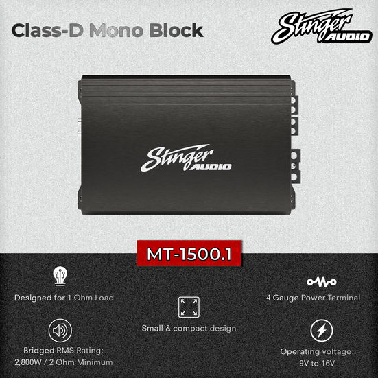 The Stinger Audio MT700.1 Monoblock car audio amplifier will deliver the power you need to increase your bass in any vehicle. This Monoblock amplifier will deliver over 700 watts RMS power at 1 ohm. The car amplifier is made for those looking for a reliable, efficient, and compact car amplifier that wont destroy your wallet. This car amplifier class d is built with a MOSFET power supply, high quality capacitors, advanced transformers, and cutting-edge inductors allowing for maximum current flow and power output making this amp extremely efficient. RMS: 300W x 1 @ 4 ohms, 500W x 1 @ 2 ohms, 700 x 1 @ 1 ohm Digital Class-D Mono Block Amplifier: Class D topology ensures high efficiency with big power and a small footprint. This single 1-channel amplifier was built for driving subwoofers and subwoofer systems, maintaining the highest sound quality sound for your car audio. Compact and Sturdy Design: Precise sound control with our durable metal potentiometer, designed for long-lasting reliability and exceptional tonal adjustments. Robust Unregulated Power Supplies: The power supply circuitry adopts advanced pulse width modulator integrated circuits that are designed to offer improved performance and efficiency. Remote Bass Controller Included: Provides remote level control of bass from listening position. With a sleek flush-mount knob for ease of installation. Designed with Advanced HEXFET Power MOSFET: Utilize advanced processing techniques to achieve extremely low on-resistance and reliable fast switching speed.