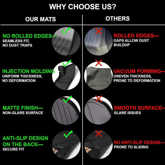 Design to offer maximum protection of the Tesla Model 3 floors from spills, stains, dirt, mud, snow and etc... Made from premium quality Thermoplastic Elastomer material (TPE tri-extruded composition) ensures 100% odorless, BPA Free, Non-Toxic and environmentally friendly. Durable and Strong - 300% better temperature resistance than normal PVC. Deeply molded grid pattern channels all spills, stains, dirt, mud or snow away from foot-well areas for easy cleanup. Model Y All Weather interior liner are comprised of High vertical walls compare to other floor mats in the market. Fitment: 2021 2022 Tesla Model 3 (Left Hand Drive Version) Full Set includes 6 pieces: 1x Driver Side Liner 1x Passenger Side Liner 1x Rear Seat Liner 1x Rear Trunk Cargo Line 1x Front Trunk Cargo Liner 1x Rear Trunk Well Storage Liner Note: The liner may be wrinkled (folded in the middle) during packaging and shipping, but it is easy to resolve. You can use a hair dryer (heated to the maximum) to heat and press the crease position of the liner, the creases will soon disappear, or the liner will return to its original shape after being laid flat for a few days. 【All-Weather Waterproof & Dustproof Mat】This model 3 Highland 6 Pieces Set floor mats provide complete protection from dirt, mud, salt, rain, snow, and sand, especially suitable for daily commuting, holiday travel, parties and pets. NOTE: Please leave mats in a warm area, the mats will regain it's custom shape after being rolled up for shipping. 【Fit For Original Car Model】Made according to 2024 Tesla Model 3 interior contours,Perfect fit, Great Looks, Pet friendly and Environmentally friendly- We insist on making environmentally friendly products, just like you who choose Tesla. The mat is made of environmentally friendly, non-toxic and recyclable TPE materials, you can safely leave your pet in the car. 【Durable Material】Non-toxic and odorless TPE material, tough & durable and easy to clean, gets better wear-resistant, heat-resistant and flexibility in hot/cold weather than traditional PVC. Raised sides give extra protection for spills and wet items. 【Dirt Resistant & Easy To Clean】Textured skid-resistant surface of the liners is easily cleaned by hosing off or simple soap and water depending on the mess. 【Good Folding】Low density material that provides more elasticity and durability. Floor Mats set may be bent from being folded over for shipping. You can use a heat gun to help it back the shape.
