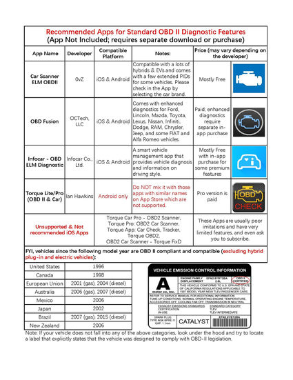Supported Devices iOS (via Bluetooth LE, no pairing in Bluetooth Setting is needed): iPhone, iPad (with Bluetooth 4.0 or above) Android phone & tablet Compatible APPs (more available on App Store and Google Play; may require purchase) OBD Fusion, Torque Pro (Android only), BimmerCode (For BMW & Mini coding), BimmerLink (for BMW diagnostics & live data), Carista OBD2, JScan (for Jeep), DashCommand, Car Scanner ELM OBD2, Dash, OBD Auto Doctor, Dr. Prius, LeafSpy, TripLog, Harry’s Laptimer, TrackAddict Supported OBD II Protocol SAE J1850 PWM SAE J1850 VPW ISO 9141-2 ISO14230-4 KWP2000 ISO15765-4 CAN When using with a proper OBD2 App, you may: Read and clear OBD II check engine light trouble codes Reset check engine light Pull many live sensor readings and get graph live data Create your own dashboard Know whether your vehicle is ready for emissions testing And more to discover! Package Includes 1 x Veepeak OBDCheck BLE OBD2 Scanner 1 x User Manual USEFUL FOR CAR OWNERS: The OBDCheck BLE+ is a small and practical OBD2 diagnostic tool which can work with various third-party Apps to achieve different functions. What functions you can get mainly depends on the chosen App and your vehicle. Please read the “Instructions for use” & “User guide (containing App & vehicle compatibility information)” on the detail page “Product guide and documents” before purchase or use. NOTE: NOT compatible with pre-2008 models or G series (including 2018+ 3 Series, 2017+ X3, 2017+ 5 Series, 2019+ X5, etc.) when used with BimmerCode; Not suitable for pre-2008 models for BimmerLink. CHECK ENGINE DIAGNOSTICS (basic functions for OBD II compliant vehicles) – When used with generic OBD II Apps such as Car Scanner ELM OBD2 (see image 2 for more compatible apps), you can read & erase engine diagnostic trouble codes, view freeze frame data, I/M readiness and real-time sensor readings (generic OBD PIDs such as O2 Readings, Engine coolant/ oil temperature, Mass air flow rate, Fuel rail pressure, Fuel Trim), which can help you fix simple engine-related problems. DO MORE (advanced functions for selected vehicles, see product image 3 for details) – When used with more professional Apps (usually requires sperate purchase), you can get advanced features like enhanced diagnostics and manufacturer-specific PIDs (such as transmission temperature, oil pressure) on selected vehicles, examine the battery in hybrid & electric vehicles, customize selected vehicles, etc. DEVICE COMPATIBILITY - Compatible with iOS via Bluetooth LE (do NOT connect with the device in iOS Bluetooth Settings; please connect directly in the OBD2 Apps) & Android devices via Classic Bluetooth (head units may not be compatible; for some Android phones in recent years, it may not show as connected after pairing but you can still start the App to connect). For detailed iOS and Android connection & troubleshooting guide, please refer to the fifth product image or user instructions. VEHICLE COMPATIBILITY – Compatible with model year 1996 or newer cars and light trucks in the US and other OBD II/ EOBD compliant vehicles in other regions for generic check engine light diagnostic functions. For hybrid plug-in and electric vehicles, please check Car Scanner ELM OBD2 App and see if there is a suitable EV connection profiles, or other Apps designed specifically for EVs. To check if your vehicle is supported for advanced diagnostics (ABS, airbag, body control, etc.), please refer to the fourth image or “User guide (App & vehicle compatibility)” on the detail page.