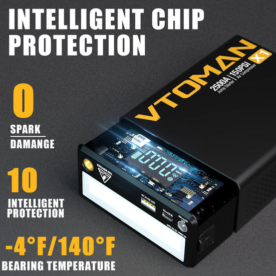 The X1 Jump starter of the VTOMAN jumpcore series was born in 2021. It was developed by researchers from famous universities all over the world after 3 years. The X1 car jump starter has a super configuration of 2500A 66.6Wh and an air compressor to help you solve car emergency Trouble starting and tire inflation. This portable car battery jumper starter battery booster set can be used safely by anyone, and has spark-proof technology and reverse polarity protection. The X1 jump box 400 lumen LED light has 3 modes: Normal, Strobe, and SOS. The 100 PSI air compressor supports inflation in three pressure units: PSI, BAR, KPA. X1 is not just a jump pack, it is also a portable power bank. Its internal battery can be used to recharge any personal mobile device like smartphones, tablets, or any other USB device that can be recharged by any powered USB port. The most important thing is that our professional and responsible after-sales service is the reason you choose us. we provide you with 16 Months of warranty service and lifetime technical support. Other commonly used search terms: car jump starter, jump starter for cars, jump starter car, jump starter, jump starter battery, jump starter lithium, motorcycle jump starter, diesel jump starter, boat jump starter, best jump starter, pocket jumper car jump starter, vehicle jump starter power pack, booster pack for car, auto battery jump starter, emergency jump starter for car, lithium car jump starter, compact jump starter, 12V battery jump starter, jump starter 2500 amp, 2500 amp jump starter, multi-function jump starter, emergency car battery jump starter, 2500A jump starter, 2500 amp jump starter, jump starter 2500A, portable car jump starter charger, booster charger jump starter, battery starter, car battery charger starter, battery jumper starter, battery jumper starter portable. 【More Than A Jump Starter】The X1 jump starter is derived from the upgraded design of 2024 which will lead the market trend in the future. This battery jump starter integrates six functions such as car emergency start, tire inflator, lighting, SOS warning, charging for mobile devices, and starting 12V vehicle-mounted devices. 【Powerful Start-Up Performance】The X1 car jump box equipped with a 2500A Peak current and can instantly start 12V vehicles (8.5L Gas/6.0L Diesel engines). Even in extreme temperatures, this car battery jump starter can start the car up to 50 times and has a service life of more than 1500+ recharge cycles. 【Air Compressor Jump Starter Combo】The jump box for car battery with air compressor has a built-in LCD digital meter. Most importantly, the X1 is equipped with a tire pressure detection function. You can preset the value( PSI, BAR, KPA) you want and it will automatically shut off when the pressure is reached. The 150 PSI air compressor takes about 2 minutes to inflate an average car tire to 20 PSI and is suitable for bikes, cars, balls, and other Inflatables. 【Upgraded Thermal Design】Jump box and air compressor unique honeycomb heat dissipation design enables the X1 jump starter to obtain more powerful heat dissipation performance, so the safety performance of the X1 car jump starter is Enhanced by 30%, and its service life is promoted by 50%. 【Safety Is The First Priority】The unique design of the X1 car battery booster makes it easy and fast to start your car in extreme environments (-4°F to 140°F), with built-in 10 safety protection technologies (over-charge, over-current, short-circuit, reverse-polarity, low-temp, high-temp, over-voltage, over-load, spark-proof, reverse-charge). VTOMAN jump starter with air compressor provides you with safety Ultimate protection.
